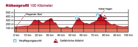 Pünktlich um 10:45 Uhr ging es nach einem neutralisierten Start auf die 100 km Strecke. Von Anfang an machte Micha und Philipp Tempo (Auf den ersten leicht ansteigenden 10 km lag der Schnitt bei 45 km/h), so dass wir nach kurzer Zeit die erste Steigung (3,5 km – 150hm) erreichten. Nach einer kurzen trockenen Abfahrt ging es weiter mit Tempo Richtung Barlissen, wo die zweite Steigung (bis zu 10%) wartete.